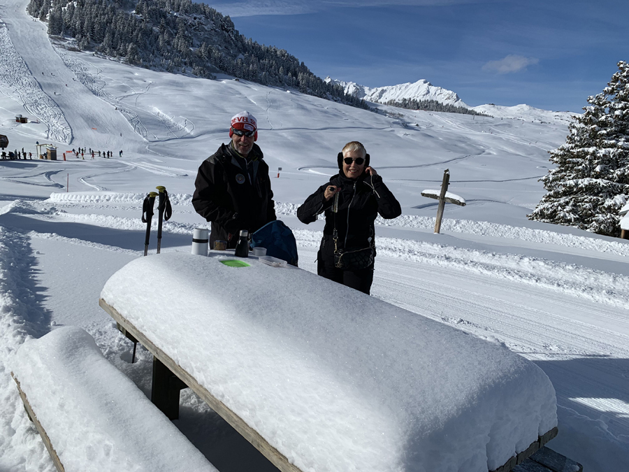 Le paysage de la porte du Parc de la Vanoise est magnifique Au détour d’un chemin, nous repérons une ancienne fruitière où l’on produisait le fameux Beaufort. Une table a été dressée avec une nappe neigeuse un peu épaisse pour une pause bienfaisante.