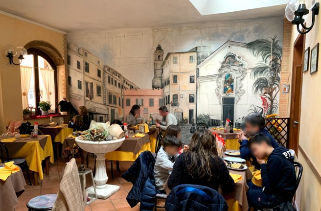 l ‘établissement a conservé certains détails de son ancienneté, le plafond, les arches, le sol en terre cuite, la fresque gigantesque, tout cela vous plonge dans un réalisme italien saisissant.