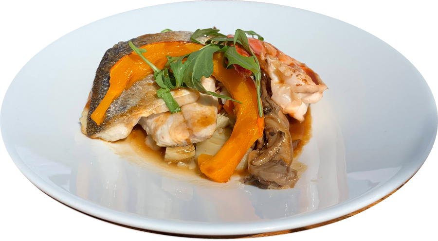 Dos de Loup, grosse Crevette Ć la plancha, artichauts « barigoule », Potimarron et champignons