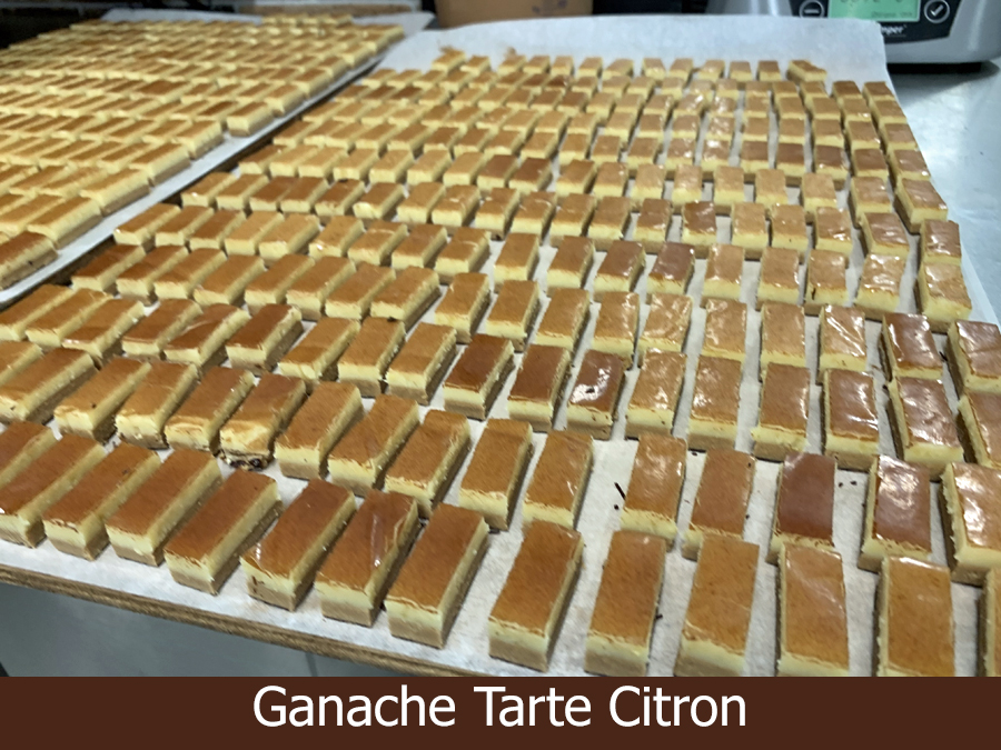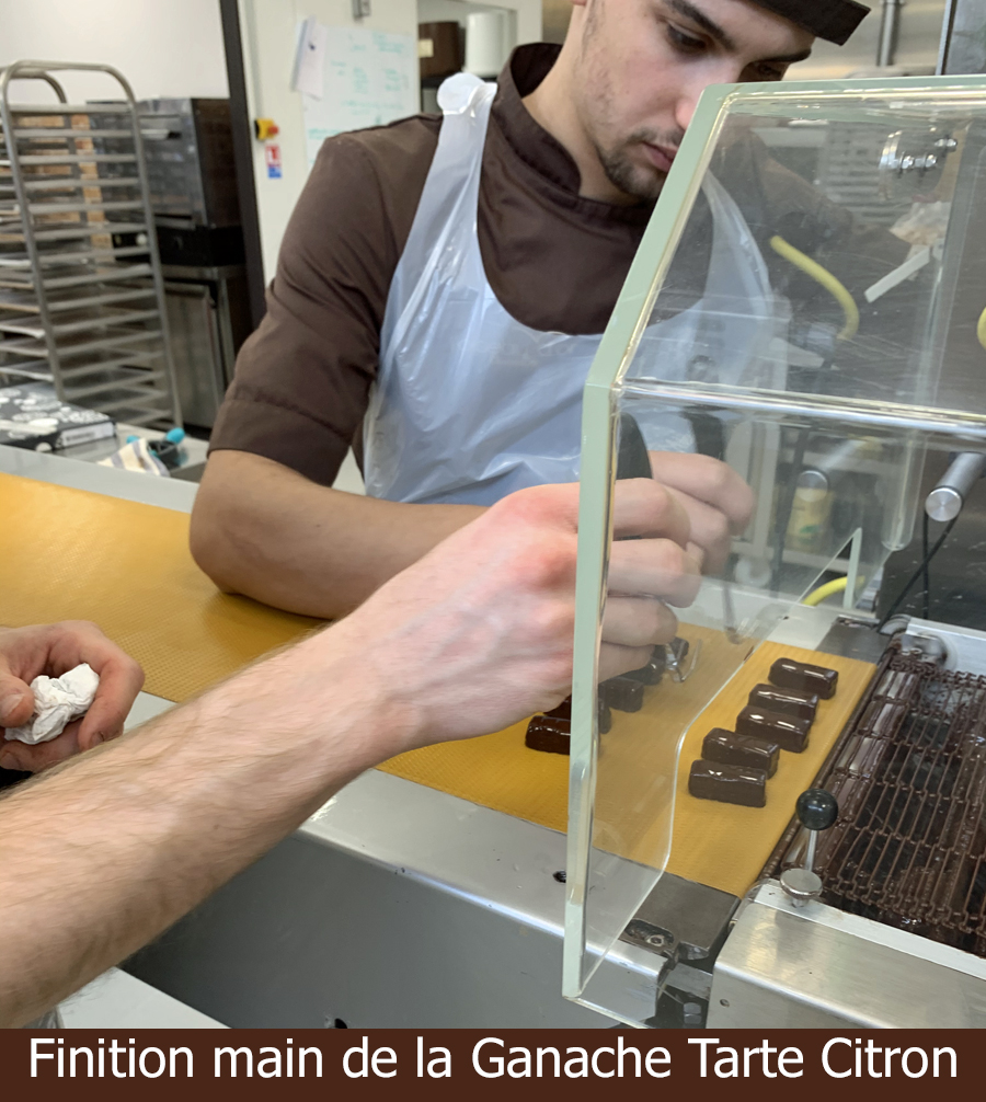 Ganache Tarte Citron. La première couche est constituée d’un praliné biscuité puis d’une ganache citron. Le tout est enrobé de chocolat noir. (c’est le chocolat préféré de Philippe).