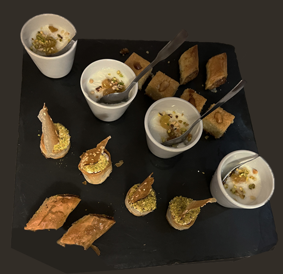 Baklawa : douceurs de feuilletées, Mouhalabié : Flan libanais à la fleur d’oranger, La Brise de Cèdre « Signature du Chef » : Rouleau dorées, crème aux pistaches et aux fruits rouges.