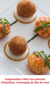 Sa recette préférée : Langoustines rôties aux piments d’Espelette, cromesquis de tête de veau, pour le mélange terre mer et le clin d’œil à la cuisine traditionnelle avec la tête de veau.