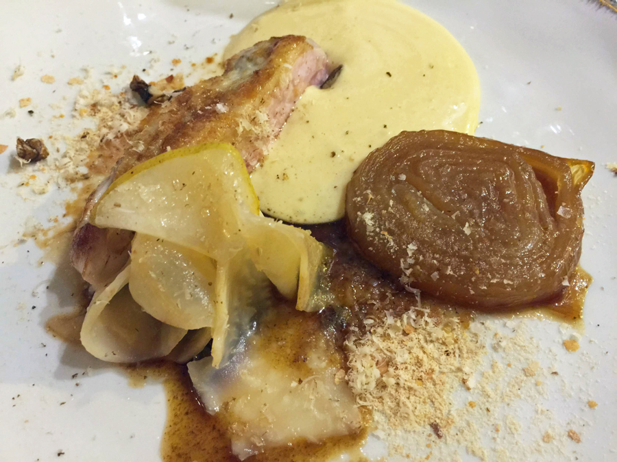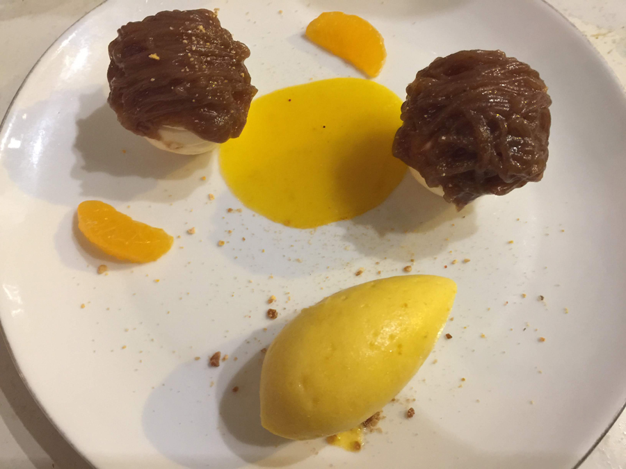 Suprême de pintade fermière, oignons, foin et vin jauneBoule de neige, crème de marron, mascarpone, meringues et sorbet mandarine