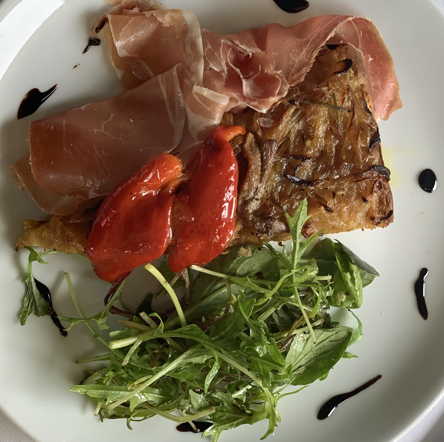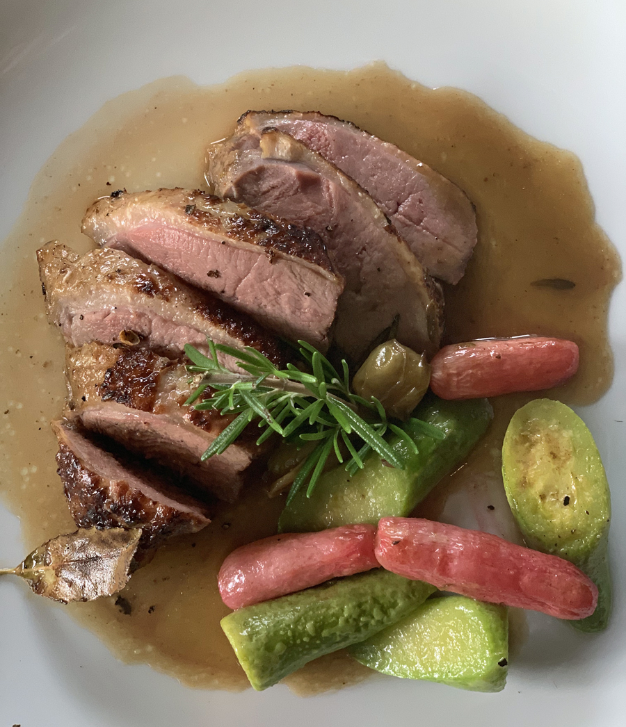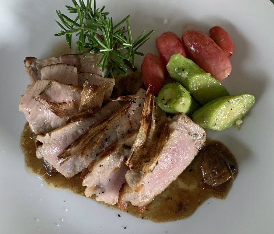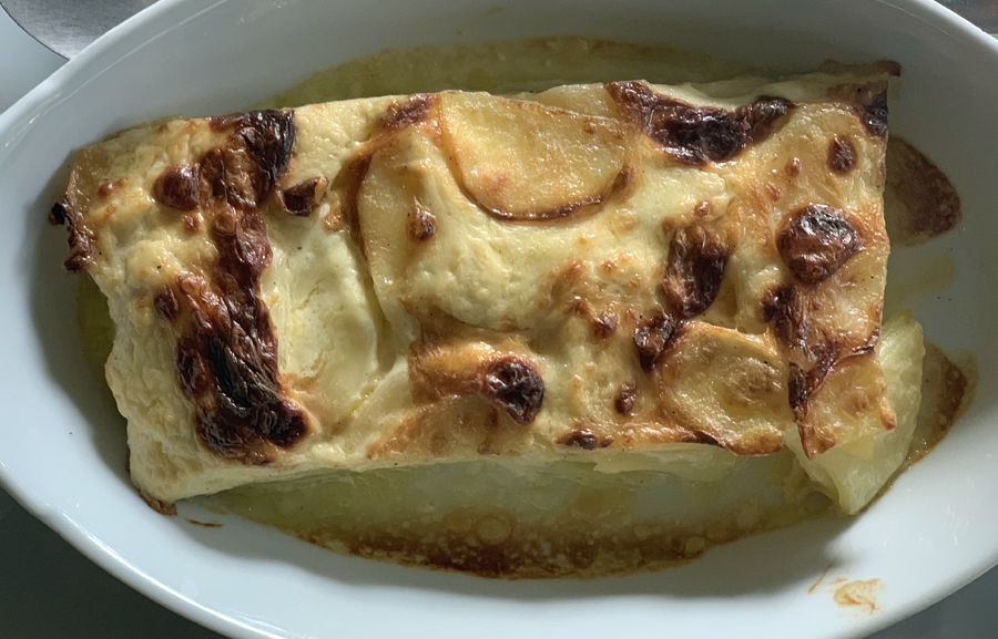 Comme plats : Suprême de canette rôtie au four ou Cotes de cochon à partager (pour deux) ou Merlu cuit à l’unilatéral, le tout accompagné d’un délicieux gratin dauphinois.