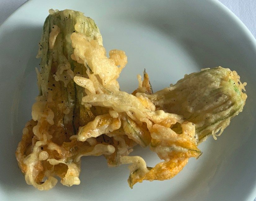 Lorsque nous y étions nous avons eu pour commencer des beignets de fleurs de courgette en amuse-bouche puis le choix en trois entrées :