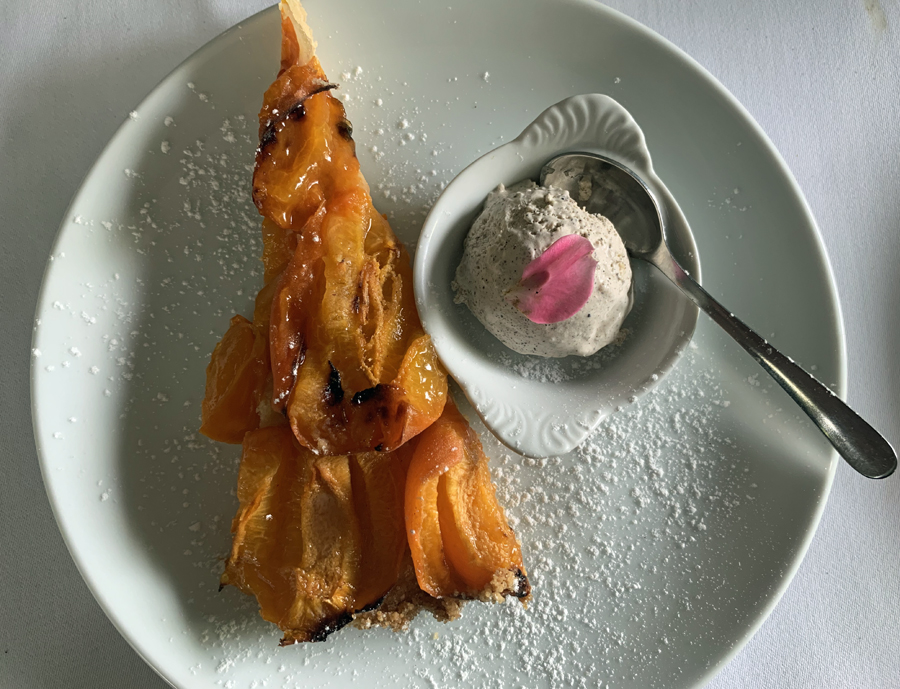 Pour les desserts Tarte à l’abricot avec glace gingembre miel et cannelle ou Pêche pochée avec glace au cacao avec du sirop d’agave en guise de sucre.